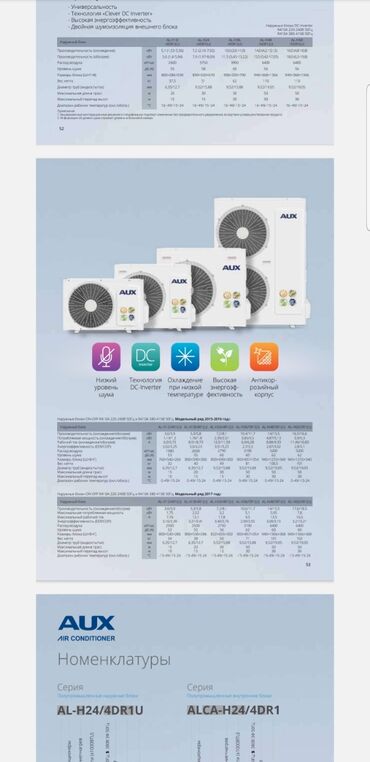 - Линейка производительности наружных блоков: от ~2.6 до ~16 кВт (модели AUX AL-H/ALCA серий; см. таблицы на изображениях)