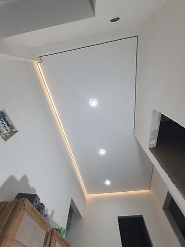 - Современные потолочные системы: цельное полотно ПВХ/ткань с врезанными LED‑линиями, спотами и трековыми светильниками.