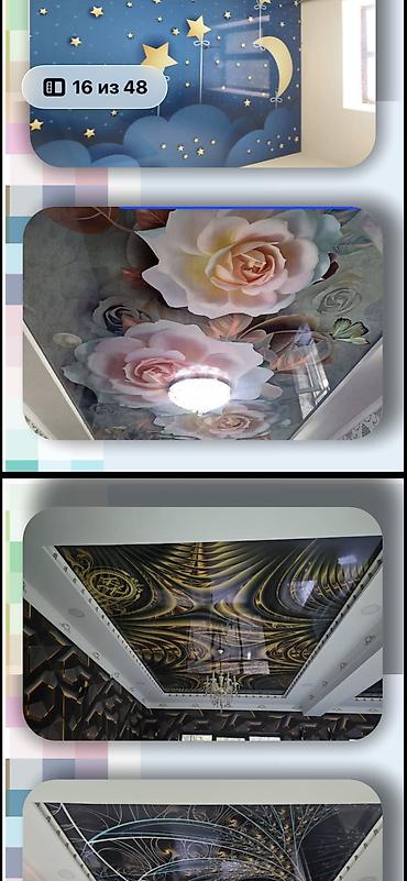 Визуальные примеры на фото: глянцевые потолки с крупными цветами, абстрактными узорами и детским космическим рисунком.
