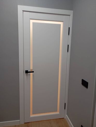 - Возможность оформления дверных проемов и стен в едином стиле: белые межкомнатные двери с прямоугольными филенками и графитовым кантом, черные ручки и петли; декоративные деревянные рейки на стене.