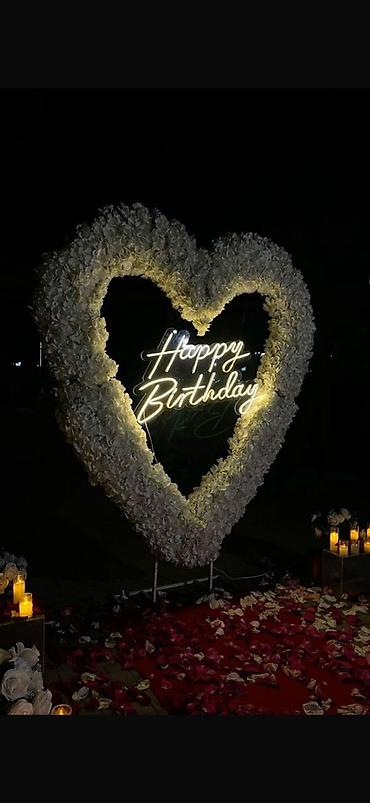 - Оформление фотозоны: сердце из цветов с интегрированной неоновой надписью, дорожка из лепестков, декоративные свечи — готовые решения для дня рождения, предложений, свадьбы, юбилеев, вечеринок.