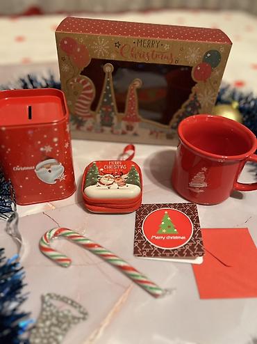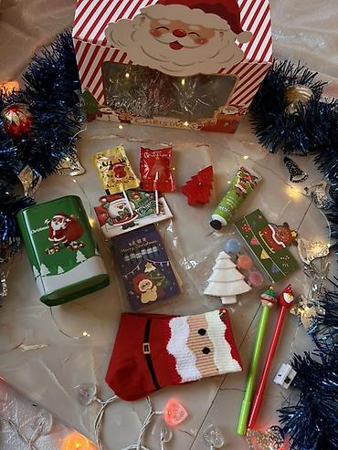 - Предметы подобраны для ощущения праздника: теплые аксессуары, сладости, сувениры и полезные мелочи.