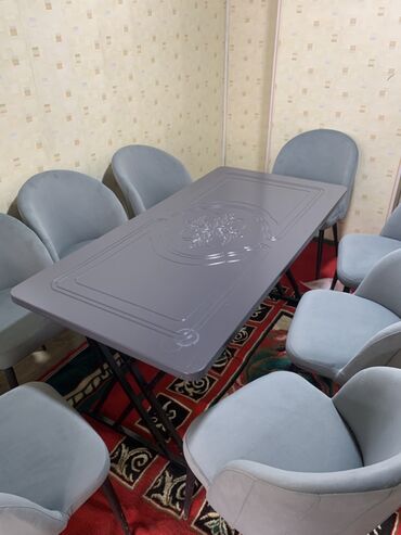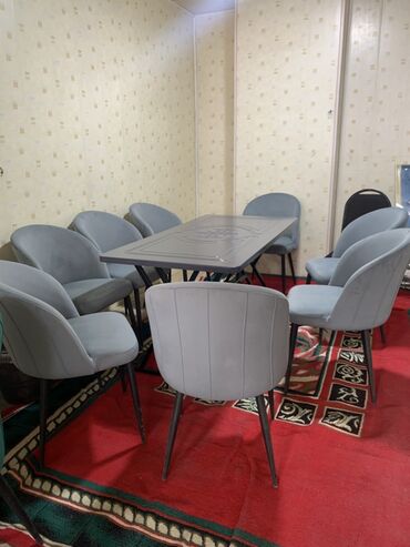 Подходит для большой кухни, столовой или переговорной. Удобная посадка и универсальная серая гамма, легко впишется в современный интерьер. Размеры визуально рассчитаны на комфортное размещение 8 человек вокруг стола. Металлическое основание обеспечивает устойчивость, а мягкие стулья — длительный комфорт при сидении. Телеграм: @abdulzhalil_a
