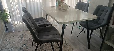 - Стулья: 4 шт., обиты тёмно‑серой тканью/велюром с мягкой прошивкой «квадратами», эргономичная спинка и сиденье, металлические ножки в тон столу.