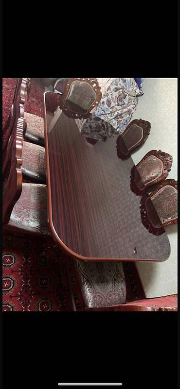 - Материал: массив/шпон тёмного дерева с глянцевым покрытием столешницы; декоративная резьба на спинках стульев.