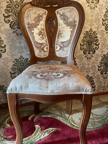 - Стулья на изогнутых ножках, резная верхняя планка спинки, мягкое сиденье.