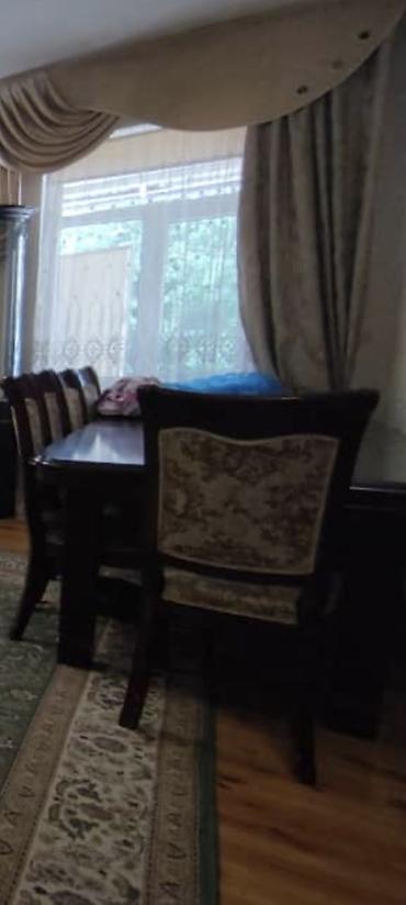- Большой прямоугольный обеденный стол из темного массива (визуально — шпонированное/массивное дерево), массивные точёные ножки, удобная посадка по длине.