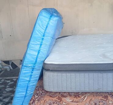 - Матрас в заводской упаковке (синий полиэтилен). Стандартная прямоугольная форма, средняя высота. Предназначен для односпальной кровати. На фото отмечен галочкой — именно он является предметом предложения.