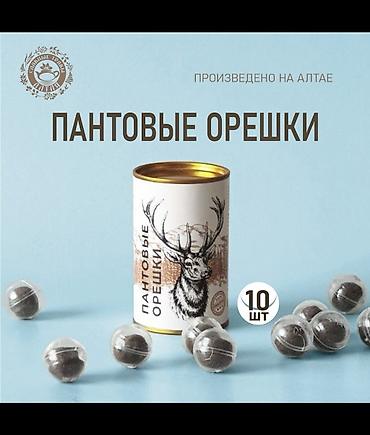 Пантовые орешки — алтайский продукт в удобной жестянойе с герметичной крышкой. На упаковке: рисунок марала и надпись «Произведено на Алтае». Внутри — 10 порционных капсул/шаров (маркировка «10 шт»), каждая индивидуально упакована в прозрачную оболочку.