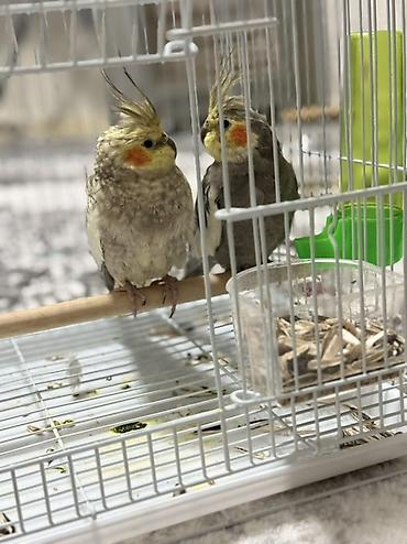 Нимфы (кореллы) в клетке - Вид: домашние попугаи нимфы (кореллы) с хохолком - Окрас: серо-белый с жёлтой маской и оранжевыми “пятнами” на щеках; в наличии несколько птиц - В комплекте: металлическ...