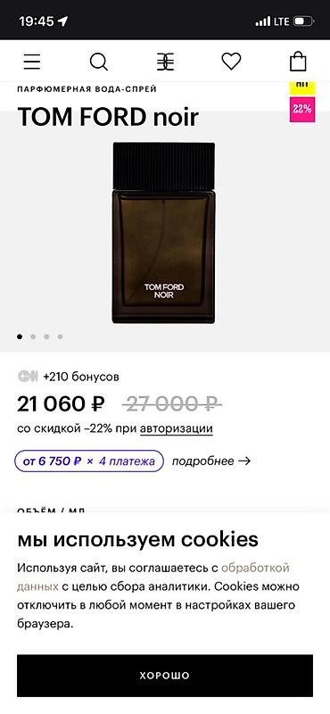 - Лаконичный тёмный стеклянный квадрат с рифлёной чёрной крышкой; надпись TOM FORD NOIR на лицевой стороне.