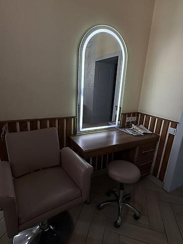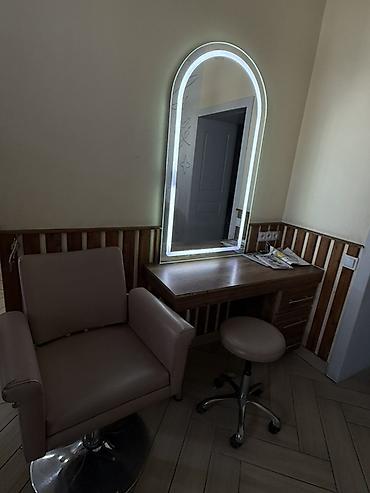 - Комплект: рабочий стол из дерева с тумбой (выдвижные ящики), большое арочное зеркало с LED‑подсветкой по контуру, парикмахерское кресло на хромированной гидроподъёмной базе, табурет на колёсах (для мастера).
