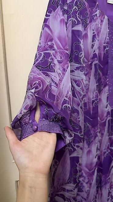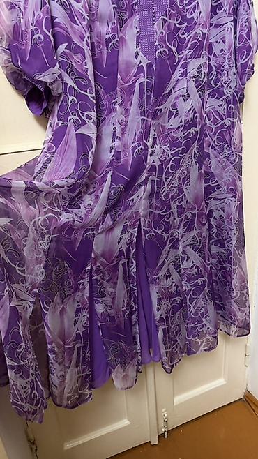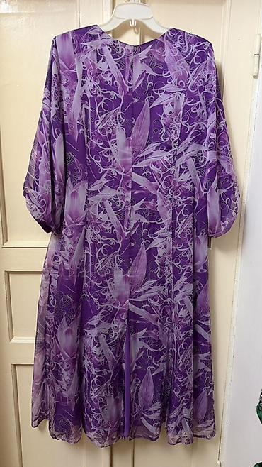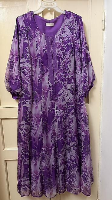 Платье женское, длинное, сиренево-фиолетовое с абстрактным цветочным принтом. Легкий полупрозрачный верх из шифона, под ним – однотонная подкладка в тон. Свободный А-силуэт, круглый вырез горловины.