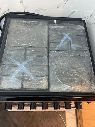 - Варочная поверхность на 4 конфорки: 3 газовые + 1 электрическая (видны газовые решётки и электрический круглый тен).