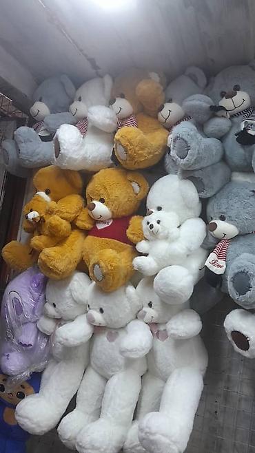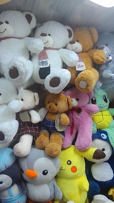 На фото представлены примеры наличия: большие белые и серые медведи, коричневые медведи с сердцем Love, пингвинчики, Пикачу, лис и ленивец в рубашках, мультяшные куклы в платьях и др.