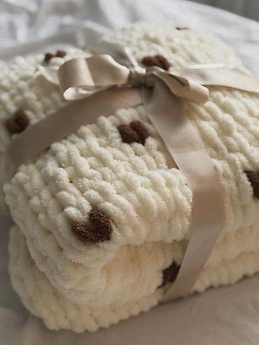 - Цвета и варианты: однотонные (белый, кремовый, бежевый, розовый, мятный, голубой, серый, терракотовый и др.) и с декором (например, контрастные сердечки). Пледы перевязаны атласными лентами — готовый вариант для подарка.