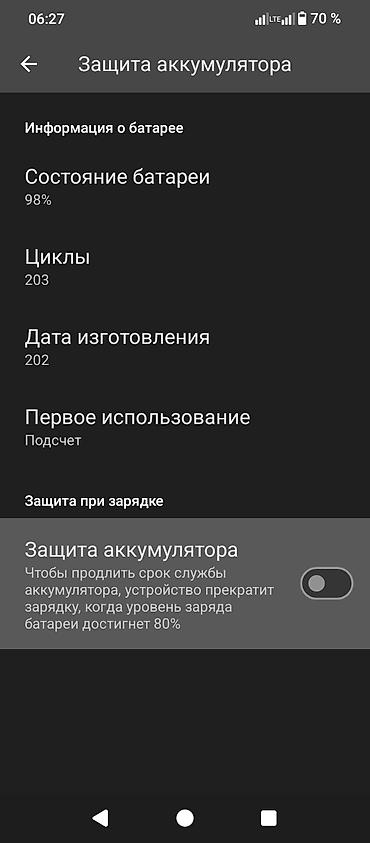 - Состояние батареи в системе — 98%, количество циклов — 203.