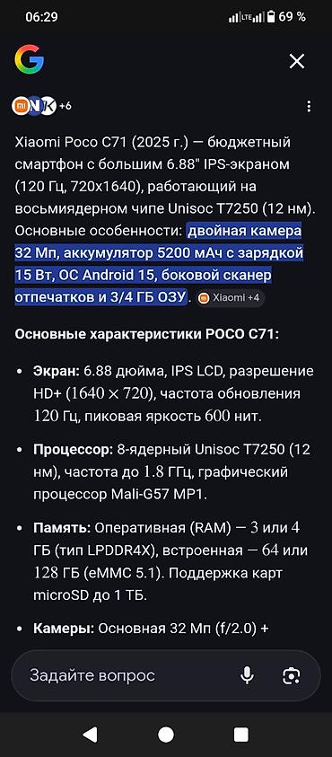 Смартфон POCO C71 Основные характеристики (указаны на заводской наклейке): - 8‑ядерный процессор - Экран 6.88" (иммерсионный дисплей) - Основная камера 32 Мп, система из двух камер - Аккумулятор 5...
