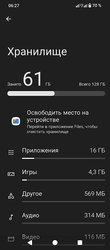 - Хранилище: всего 128 ГБ, занято 61 ГБ на момент снимка (Приложения ~16 ГБ, Игры ~4.3 ГБ и др.).