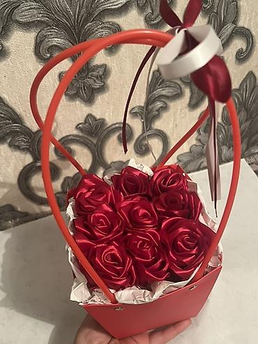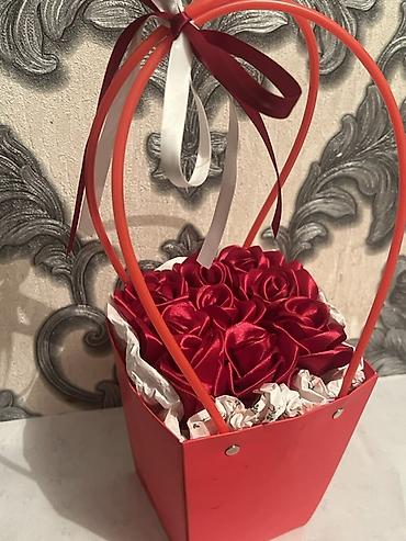 - Внутри декоративная бумага; сверху композиция дополнена бантами из атласных лент белого и бордового оттенков.