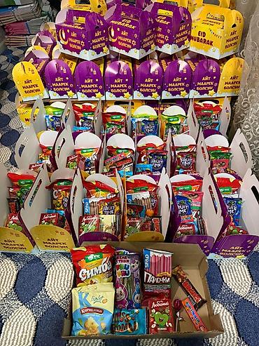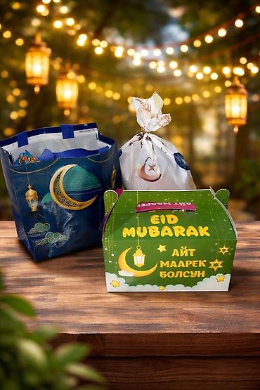 - Праздничные коробки с ярким оформлением «EID MUBARAK / Айт маарек болсун» — удобные ручки, плотный картон.