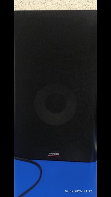 Комплект: активная колонка, пассивная колонка, сетевой кабель (несъемный). Бренд Microlab виден на передней панели. Дата на фото: 04.02.2026.