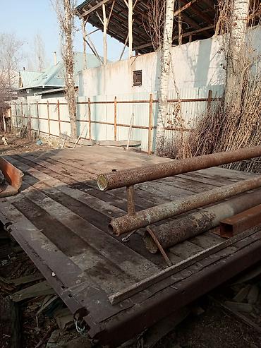 - Настил из толстых досок и листового металла, борта/стойки отсутствуют; сверху лежат трубы — как груз на площадке.