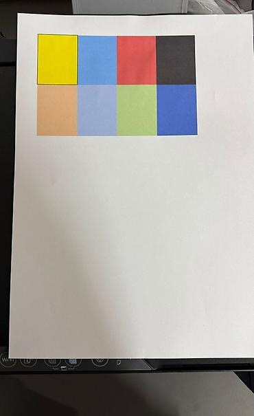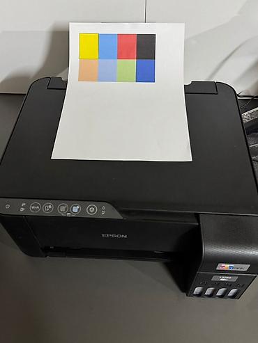 - Печать в цвете и чёрно‑белая; показан тестовый отпечаток с равномерной заливкой цветов