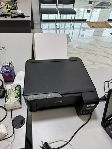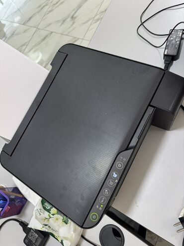 В комплекте на фото виден сетевой адаптер/кабель. На корпусе — индикаторы уровня чернил. Модель компактная, удобна для дома и офиса.