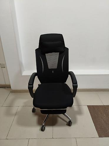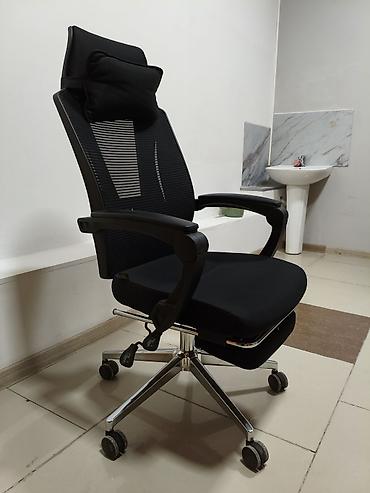 Эргономичное офисное кресло черного цвета с сетчатой спинкой и подголовником. Оснащено регулируемыми подлокотниками, поясничной поддержкой и выдвижной подставкой для ног. Идеально подходит для длит...