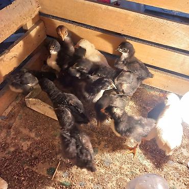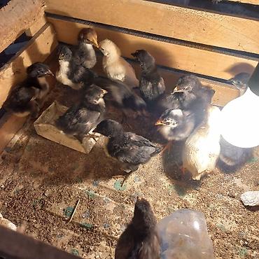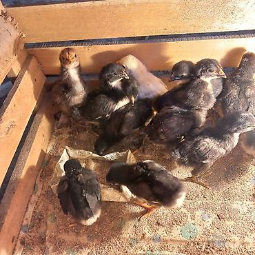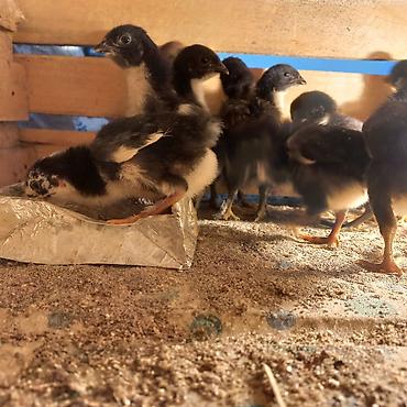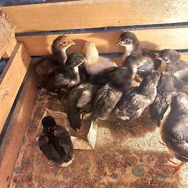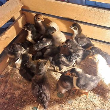 Цыплята молодки, разноокрашенные (преимущественно черные с белыми отметинами, есть светлые/белые). Содержатся в брудере под лампой, активные, на крепких лапках. Кормление стартовым комбикормом, доступ к воде. Подходят для личного подсобного хозяйства: мясо-яичное направление, быстрый набор веса и раннее начало яйцекладки в дальнейшем. Удобны для выращивания в домашних условиях, хорошо переносят содержание в клетке или на полу.