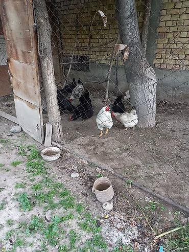 - Небольшое поголовье кур в ограждённом вольере: чёрные несушки и петух белого окраса.