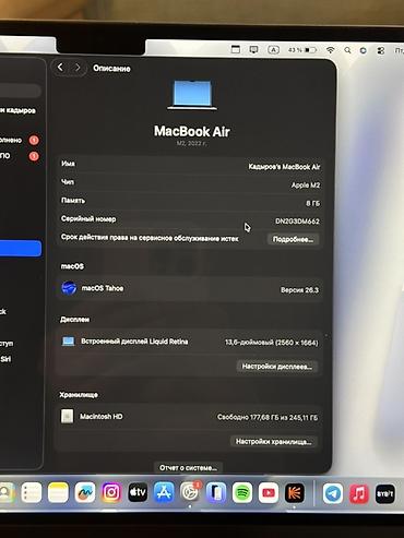 Macbook Air 13 M2 8GB/256GB Продается ноутбук Macbook Есть светлая вертикальная линия в правой части экрана - появилась давно, так что дальнейшей деградации панели не будет. Также не работает родн...