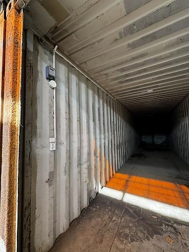 - Металлический морской контейнер, расположенный в закрытой галерее под высоким арочным навесом — защита от осадков и прямого солнца, удобный подъезд по широкому проходу.