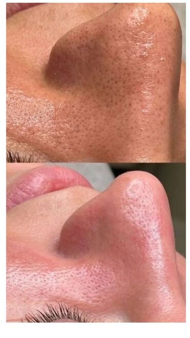 Услуга направлена на глубокое очищение и визуальное сужение пор, выравнивание рельефа и придание коже гладкого, чистого и ровного вида. На фото — результат «до/после» сразу после процедуры.