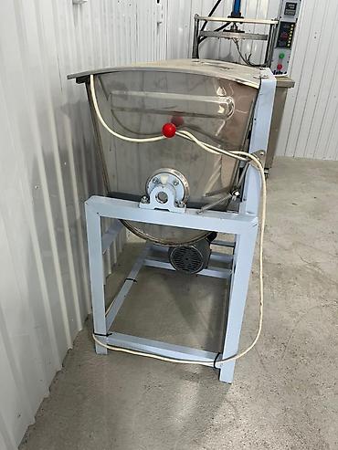 - Конструкция: корытообразная рабочая ёмкость из нержавеющей стали на жёсткой раме, приводной мотор снизу, закрытый кожух редуктора сбоку.