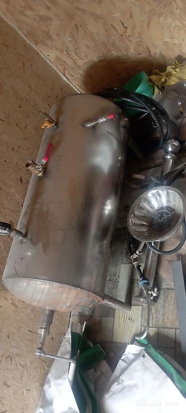 - Вертикальный цилиндрический резервуар из нержавеющей стали с патрубками, кранами и штуцерами под подачу/отбор, предустановленными шаровыми кранами, резьбовыми соединениями и ножками-опорами. Подходит как буферная емкость/сатураторная колба для работы под давлением (требуется проверка и обвязка под ваши параметры).