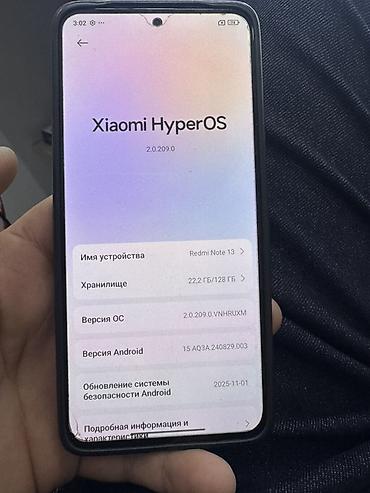 Смартфон Xiaomi Redmi Note 13, установленная система Xiaomi HyperOS 2.0.209.0 (Android 15). Хранилище: 128 ГБ, доступно около 22,2 ГБ. На экране каплевидный вырез под фронтальную камеру. На задней панели — тройной модуль камер и светодиодная вспышка.