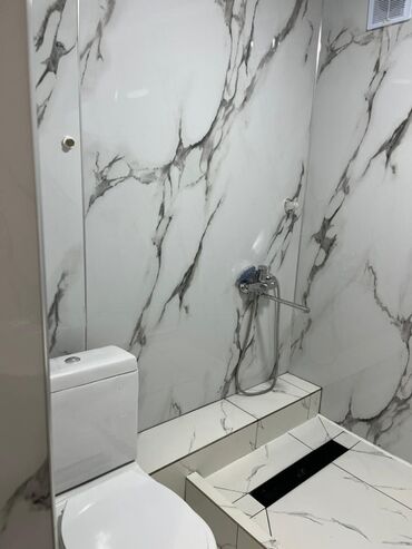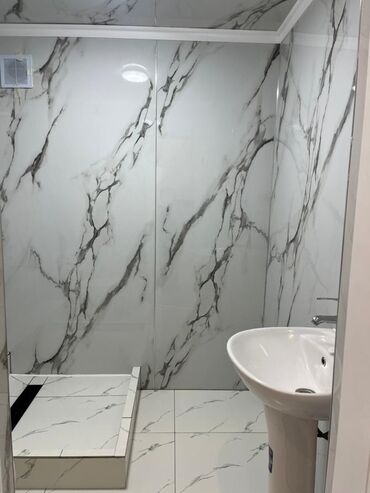 - Пол и стены облицованы крупноформатной плиткой под белый мрамор с серыми прожилками.