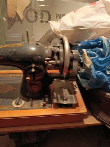 В комплекте: швейная машина на деревянном основании, металлическая игольная пластина, маховик с ременным приводом, деревянный кофр.