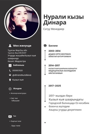 - Дополнительные данные из резюме: владение кыргызским и русским языками; навыки ответственности и внимательности; опыт работы в медицинской сфере (городская больница г. Кызыл-Кыя).