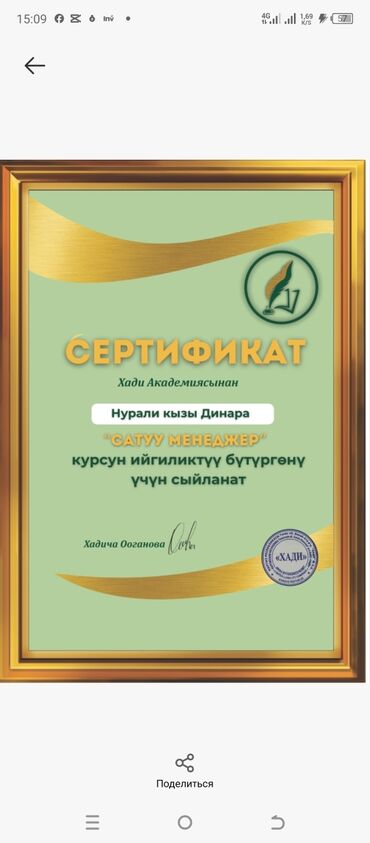 - Образование и подтверждение квалификации: сертификат Хади Академиясы о успешном завершении курса «Сатуy менеджер» (менеджер по продажам). На сертификате указаны данные выпускницы и печать организации.