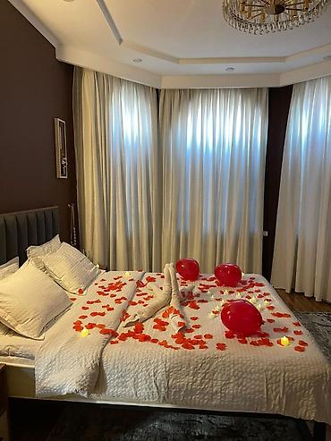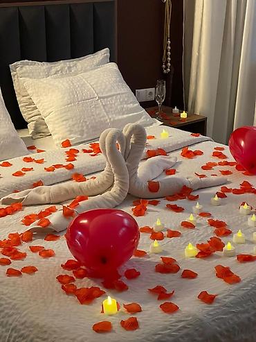Создадим атмосферу для особого вечера: нежный декор кровати лепестками роз, свечами и воздушными шарами, композиции из полотенец в виде лебедей, сервировка бокалов для напитков. Подходит для предложения руки и сердца, годовщины, дня рождения, сюрприза для второй половинки.