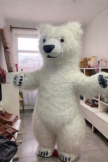- Большой ростовой костюм белого медведя с пушистым мехом, объемной мордой и выразительными глазами.
