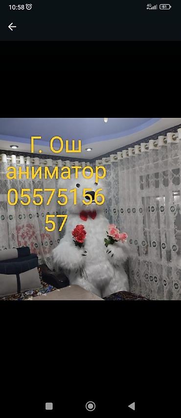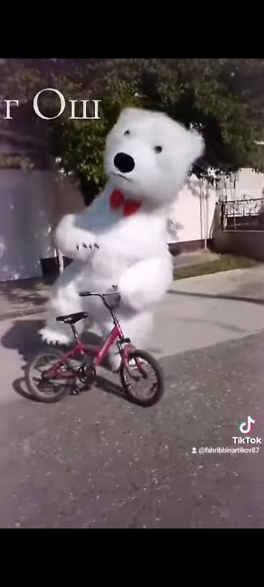 - Большой ростовой мишка с красной бабочкой: эффектное появление на праздниках, днях рождения, предложениях руки и сердца, выпускных и рекламных акциях. Танцы, фотосессии, поздравления, интерактив с гостями. Возможен выезд по городу Ош (судя по фото).