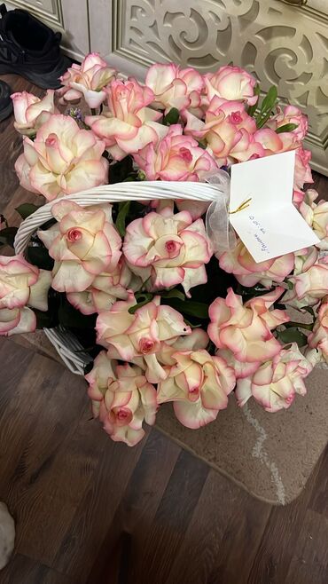 - Корзина из белой лозы, плотно укомплектованная розами. Есть открытка на ленточке для поздравления.