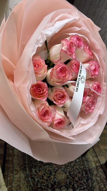 - Классический монобукет в пастельной упаковке (пленка и дизайнерская бумага нежно‑розового оттенка) с брендированной лентой “Premium Flowers”.