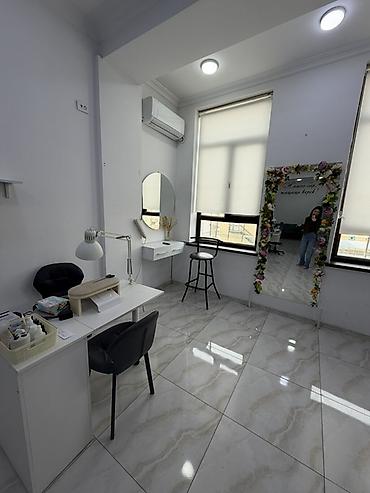 - Оснащение: рабочие столы и стулья на колесах, кольцевая лампа, настольные лампы, полки-органайзеры для материалов, мобильные ширмы/шторы для приватности, зеркала (в т.ч. полноразмерное с декоративной рамой), кондиционер, раковина/тумбы для принадлежностей.