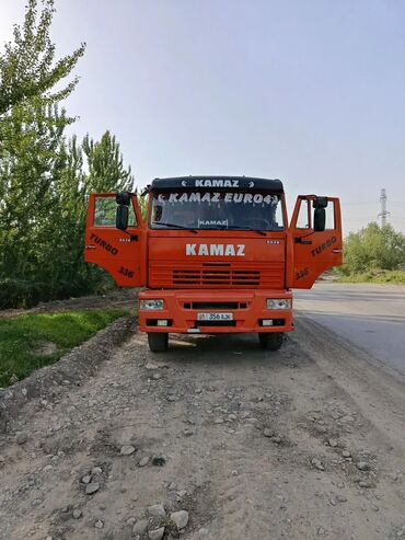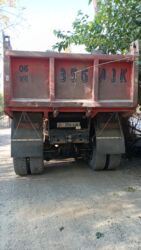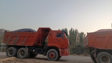 Самосвал с оранжевым кузовом, предназначенный для перевозки сыпучих материалов. Оснащен двойными задними колесами для улучшения устойчивости и грузоподъемности. Задние фонари и брызговики обеспечив...