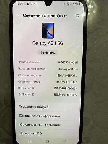 - На экране показана информация о телефоне: Galaxy A34 5G, модель SM‑A346E/DSN, два IMEI (Dual SIM).